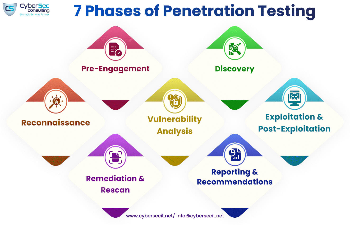 As part of a comprehensive web and mobile application security assessment service, penetration testing follows a structured and methodical approach. These seven phases of penetration testing ensure that vulnerabilities are identified, validated, and addressed in a way that mirrors real-world attack scenarios while minimizing business disruption.